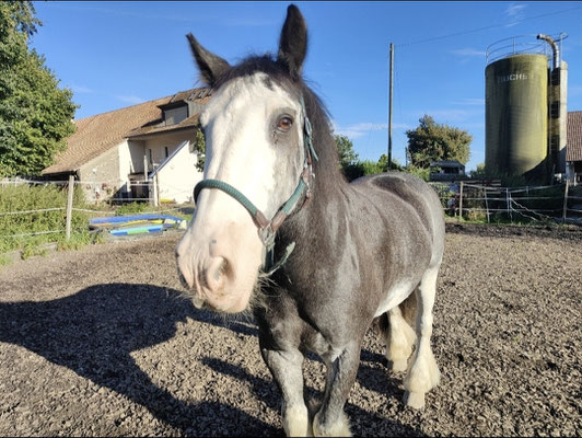 Linus, der Tinker mit seiner speziellen Farbe Blue Roan fällt einem gleich ins Auge. Seine Musterung, sein Behang, der üppige Schweif und sein freundliches zugewandtes Wesen suchen Seinesgleichen. Die Beine und der Behang werden gut gepflegt, deshalb hat er auch keine Mauke, höchstens paar trockene Stellen, die mit guter Pflege kein Problem darstellen. Ab und zu im weissen Teil, eine offene Stelle von Insektenstichen, welche mit Desinfektion gut abheilt. Bei Linus wurde vor Jahren Spat festgestellt, dieser wurde gespritzt und seither bestehen keine Probleme mehr, er muss allerdings gut Warmlaufen können. Ansonsten ist er kerngesund.