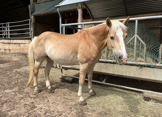 Ein hübscher Haflingerwallach steht da plötzlich vor mir. Er mustert mich etwas skeptisch und zieht dann von dannen zur Heuraufe.