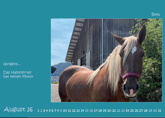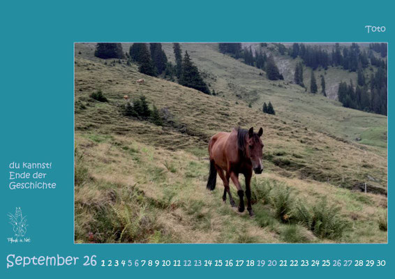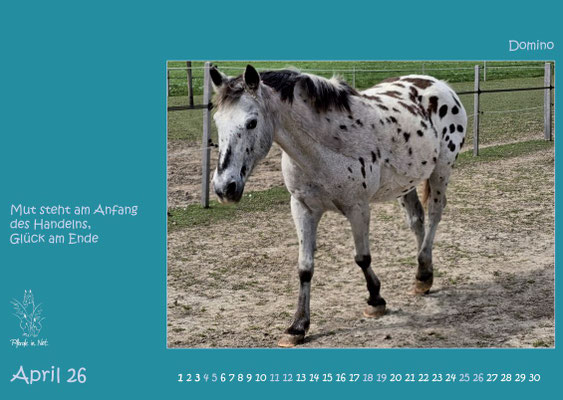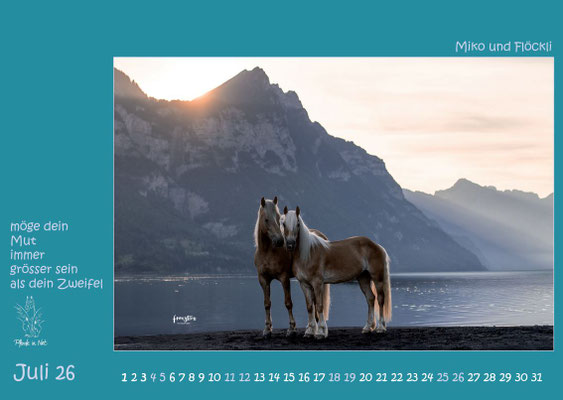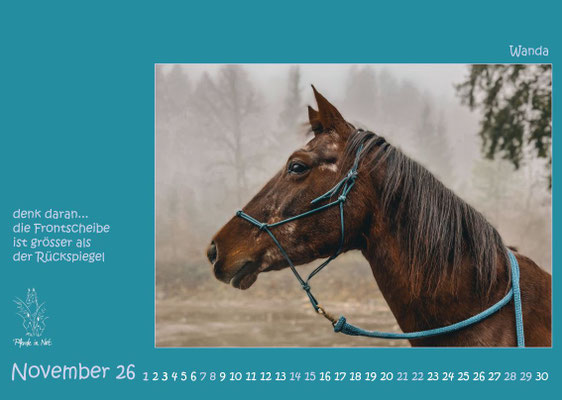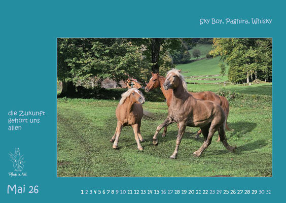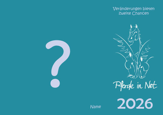 Jahreskalender 2026 mit Bildern von Pferden, die entweder in stationären PiN-Herden leben oder durch den Verein Pferde in Not an neue Plätze vermittelt wurden oder werden. Das Titelblatt und das